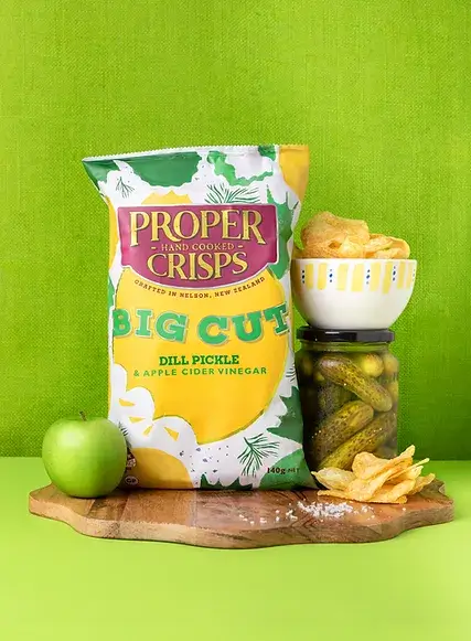 Our Dill Pickle and Apple Cider Vinegar chips are thickly cut golden potatoes dusted with zingy Apple Cider Vinegar for a lip-puckering tang, a hint of dill and subtle pickling herbs. We think they’re a dill-iciously BIG flavour.