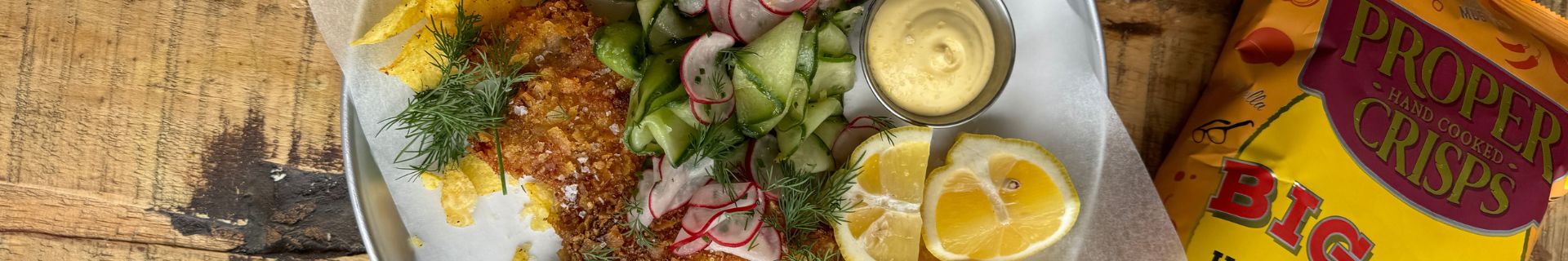 Serve the schnitzel with the salad, mustard mayonnaise and a handful of cheeza-peno tortilla chips (if desired). Garnish with the lemon wedges and dill.